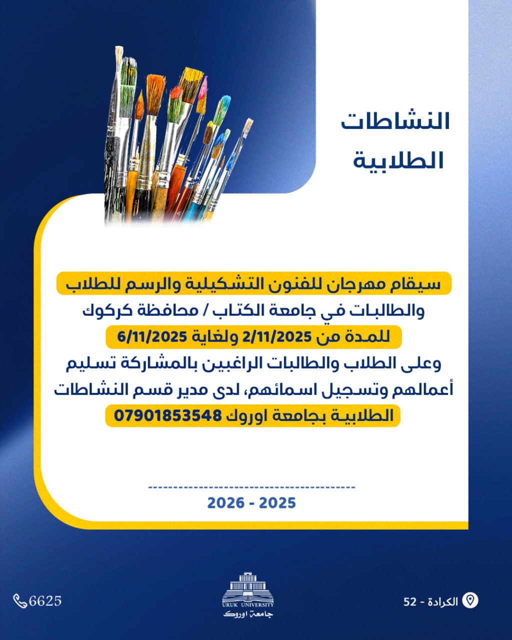 وعلى الطلاب والطالبات الراغبين بالمشاركة تسليم أعمالهم وتسجيل اسمائهم، لدى مدير قسم النشاطات الطلابية بجامعة اوروك 07901853548