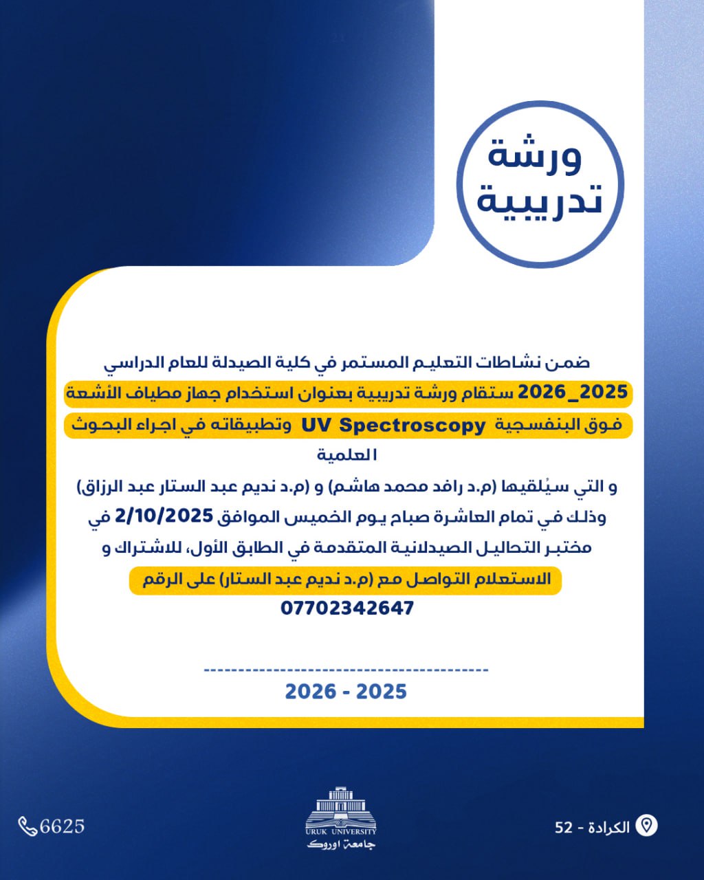 ضمن نشاطات التعليم المستمر في كلية الصيدلة للعام الدراسي ٢٠٢٥_٢٠٢٦ ستقام ورشة تدريبية بعنوان (استخدام جهاز مطياف الأشعة فوق البنفسجية و تطبيقاته في اجراء البحوث العلمية UV Spectroscopy) و التي سيُلقيها (م.د رافد محمد هاشم) و (م.د نديم عبد الستار عبد الرزاق) وذلك في تمام العاشرة من صباح يوم الخميس الموافق 2/10/2025 في مختبر التحاليل الصيدلانية المتقدمة في الطابق الأول، للاشتراك و الاستعلام التواصل مع (م.د نديم عبد الستار) على الرقم (٠٧٧٠٢٣٤٢٦٤٧)