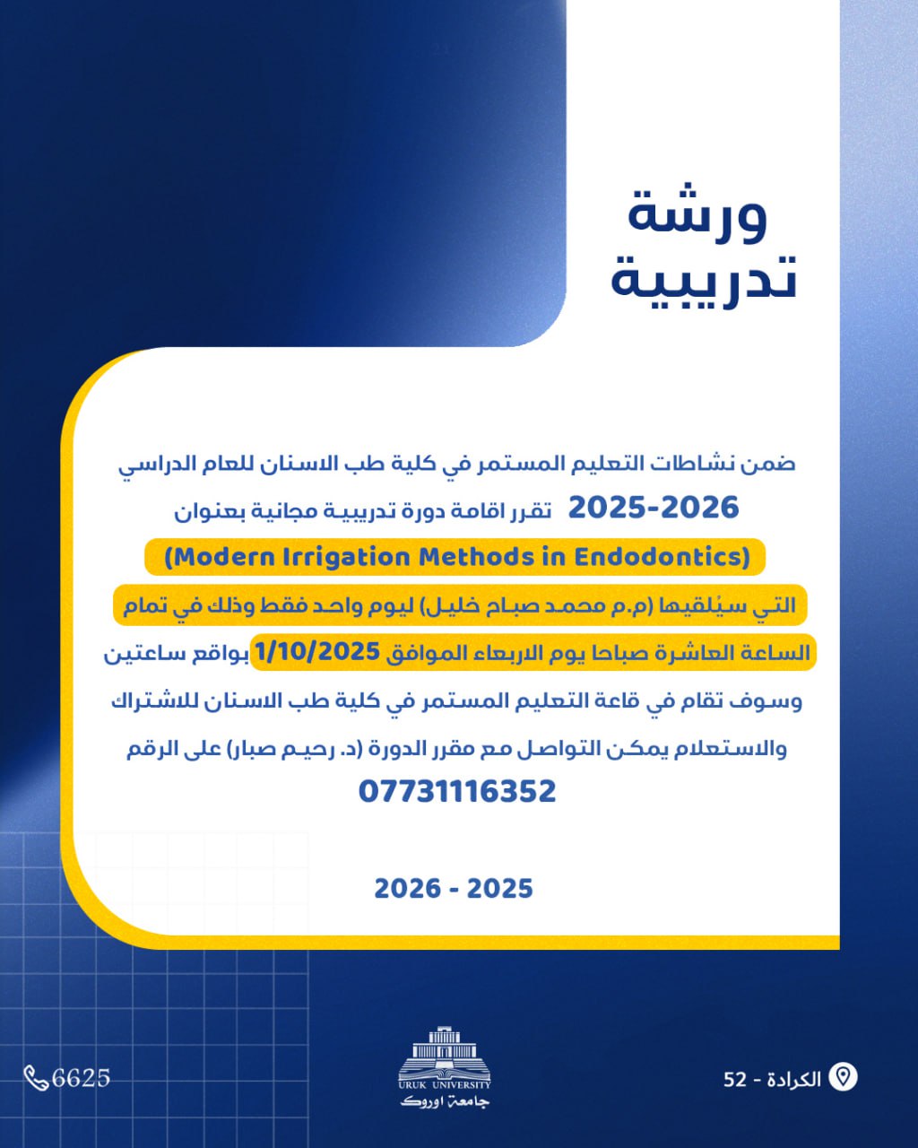 ضمن نشاطات التعليم المستمر في كلية طب الاسنان للعام الدراسي 2025-2026، تقرر اقامة دورة تدريبية مجانية بعنوان