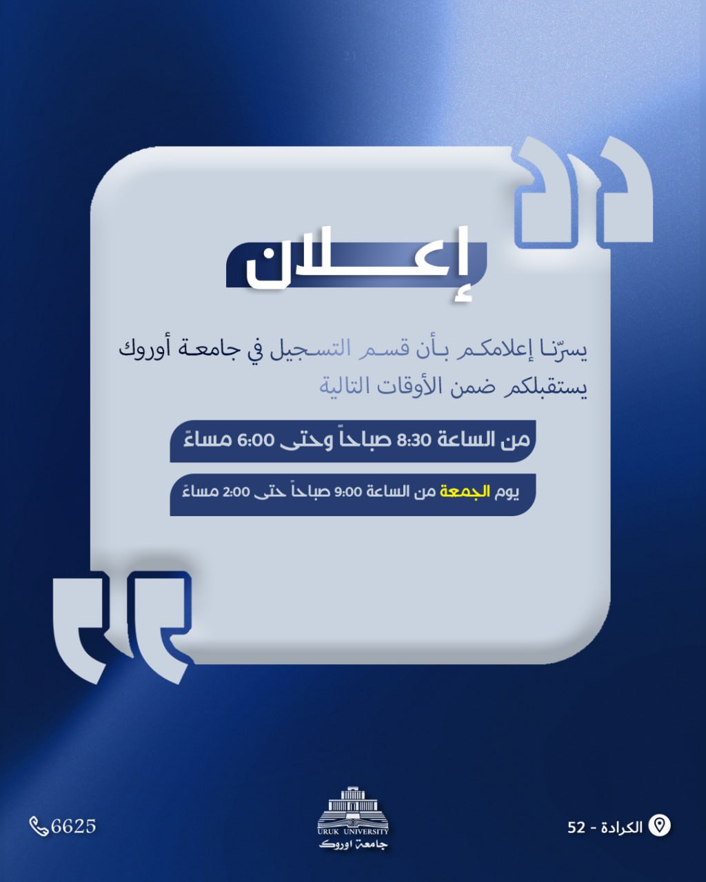 تعلن جامعة اوروك ولجميع طلبتنا الكرام الراغبين بالتقديم للعام الدراسي الحالي 2025-2026 على ان الاستضافة من الدراسة المسائية الى الدراسة الصباحية مجانا وبدون اي تكاليف اضافية ونسأل الله لكم التوفيق في اختياراتكم مع امنياتنا بالتوفيق علما ان قسم التسجيل في جامعة أوروك يستقبلكم يومياً من الساعة 8:30 صباحاً وحتى 6:00 مساءً ويوم الجمعة من الساعة 9:00 صباحاً حتى 2:00 مساءً