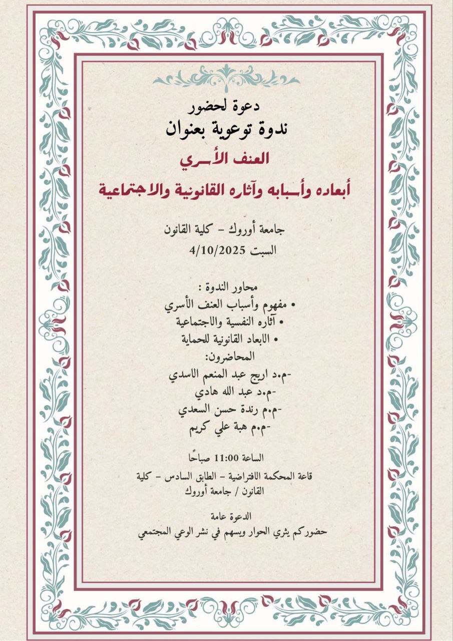 ستقيم كلية القانون في جامعة اوروك يوم غد السبت المصادف 4/10/2025 ندوة توعوية بعنوان : "العنف الأسري أبعاده وأسبابه وآثاره القانونية والاجتماعية"