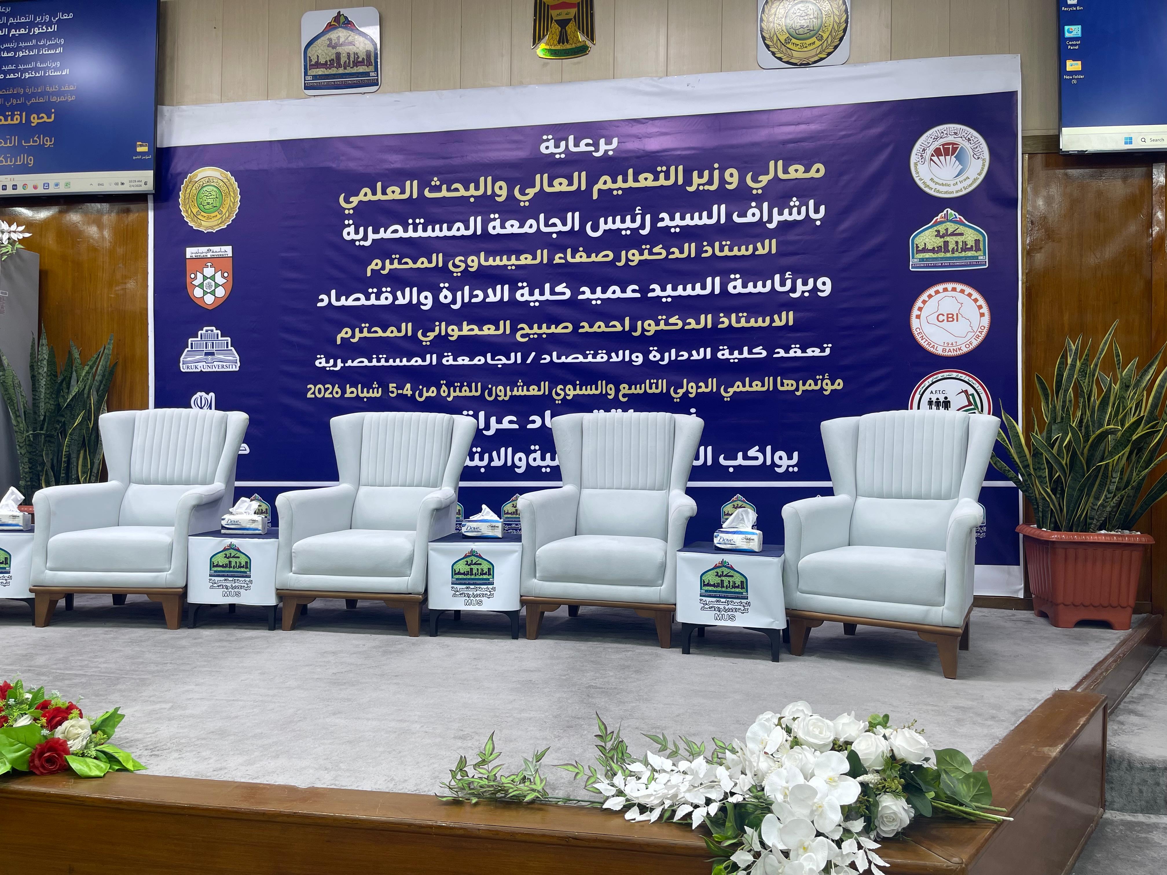 تحت شعار ( نحو اقتصاد عراقي يواكب التحولات التقنية والابتكار الرقمي) وبرعاية معالي وزير التعليم العالي والبحث العلمي الدكتور نعيم العبودي وبإشراف السيد رئيس الجامعة المستنصرية الاستاذ الدكتور صفاء العيساوي أقامت كلية الادارة والاقتصاد في الجامعة المستنصرية مؤتمرها العلمي الدولي التاسع والسنوي العشرين يومي الرابع والخامس من شباط 2026 الذي ترأسه السيد عميد كلية الادارة والاقتصاد الاستاذ الدكتور احمد صبيح العطواني. ولقد حضر جلسة الافتتاح وفد جامعة أوروك ممثلا بالسيد رئيس الجامعة الاستاذ الدكتور يحيى يحيى فريد والسيد عميد كلية الادارة والاقتصاد الاستاذ الدكتور عبد الستار عبد الجبار موسى والسيد معاون العميد الدكتور سيف الحمداني. هذا وقد قدمت في المؤتمر بحوث ومداخلات تضمنت تفاصيل منبثقة من روح شعار المؤتمر وتفصيلاً لما انطوى عليه من رؤى وتصورات.